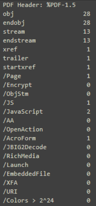 ThreatLocker Threat Intelligence started the analysis by using two PDF tools developed by Didier Stevens: pdfid.py and pdf-parser.py.