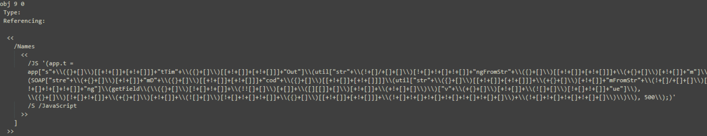 A quick analysis of the sample with pdfid.py identified suspicious key strings such as "obj", "JavaScript", and "JS", all with significant occurrence counts. The presence of embedded JavaScript identified within the PDF raises suspicion and warrants further investigation. Running the sample through pdf-parser.py revealed heavily obfuscated JavaScript within "obj9".