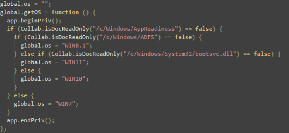 The script also checks the read-only status of specific system files and folders associated with certain versions of Windows. By checking which paths exist or are accessible, the script can determine which version of Windows the victim is running.