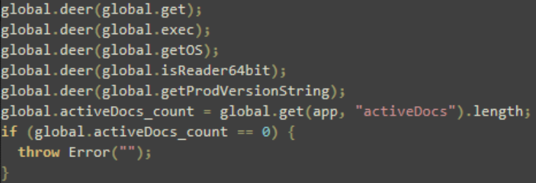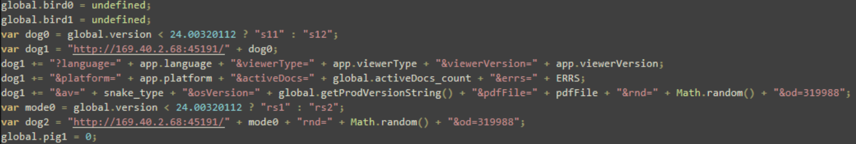 The provided PDF targets vulnerable Adobe Reader versions and fingerprints victims that open the file. The malicious PDF then collects system information such as operating system, product version, and language setting. This step helps attackers determine whether the system is vulnerable and worth further exploitation.