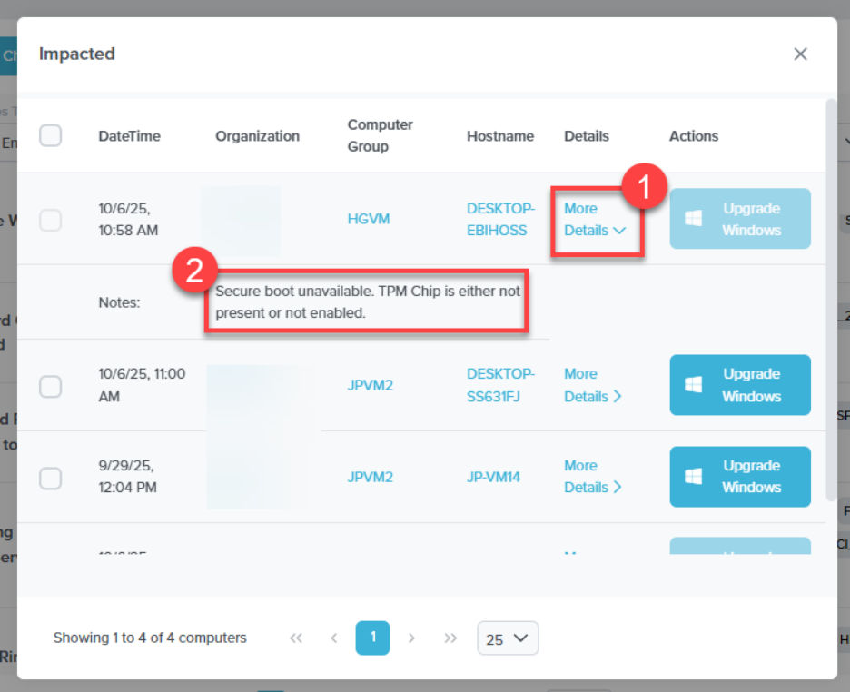 In addition to not being selectable, ThreatLocker will provide a reason why this machine cannot be upgraded to Windows 11. This reasoning is found by selecting the 'More Details' dropdown in the 'Dropdown' column.