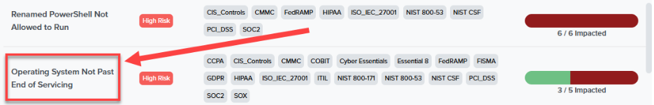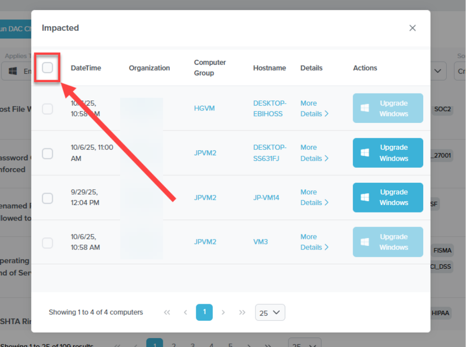 To view the impacted machines in your organization, navigate to the 'Results' column of your DAC dashboard. This will display the computers that are impacted or not impacted by this DAC check. Selecting the 'red' portion of the 'Results' bar will open a pop-up containing a list of your impacted machines.