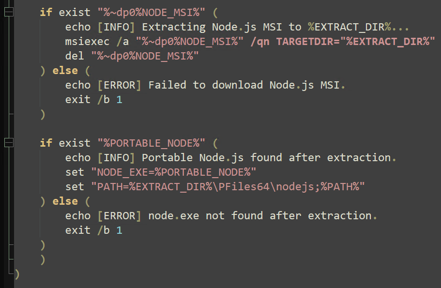 This next set of commands ensures that several other dependencies are installed: the Node.js framework, Hardhat (a development environment for Ethereum), and Node.js packages “Axios”, “FS”, “request”, and “clipboardy”. If the Node.js framework is not found, the script halts with no further action.