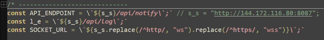 This script also defines the socket URL with the same variable “s_s”, replacing “http” with “ws” to match WebSocket syntax.