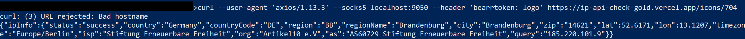 Although all previous connections were made using Curl, the final payload can only be requested with the Axios library, regardless of user agent and header. Any requests made to this page without Axios return meaningless JSON data with the user’s IP address and geolocation data.