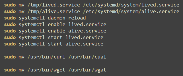 Another notable evasion tactic is the renaming of tools in use such as “curl” and “wget”. To prevent detection platforms from recognizing suspicious use, these tools are renamed to “cual” and “wgat” respectively.