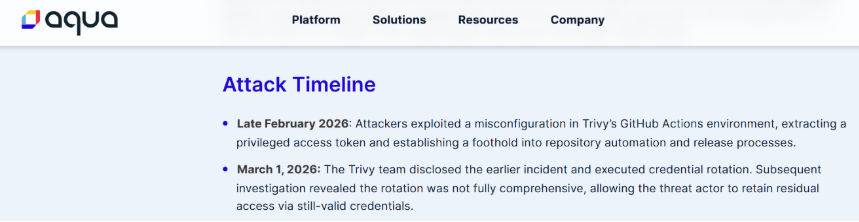 On March 1, 2026, the Trivy team identified this malicious workflow push and began efforts to remediate by rotating credentials to remove the attackers from their environment. Although an attempt was made to rotate credentials, this rotation was non-atomic, and TeamPCP was able to maintain access.