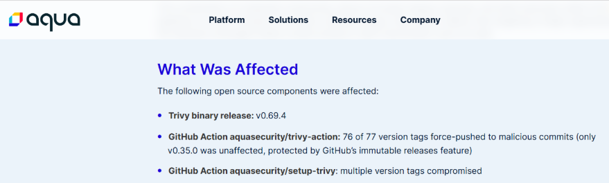 With continued access, TeamPCP force-pushed malicious code to 76 of 77 version tags in the “aquasecurity/trivy-action” repository, all seven tags in “aquasecurity/setup-trivy”, and “aquasecurity/trivy” version 0.69.4.