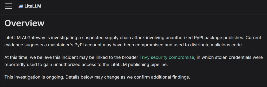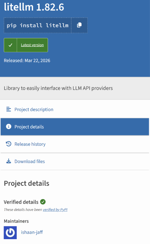 The timeline suggests that the malicious Trivy force-push events eventually led to the PyPI account of LiteLLM maintainer “krrishdholakia” being hijacked. A public advisory was released by the two LiteLLM maintainers, “krrishdholakia” and “ishaan-jaff”, stating that “a maintainer’s PyPI account may have been compromised.” User “krrishdholakia” has since been removed from the PyPI LiteLLM account as a maintainer.