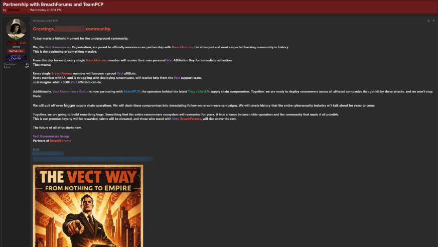 In a perfect world, on the announcement of the Trivy & LiteLLM compromises, the affected communities would diligently rotate any sensitive credentials, keys, and secrets. However, delays in complete credential rotation provided TeamPCP with the opportunity to partner with the Vect ransomware group, who have announced they will be providing affiliate keys to every member of the BreachForums community.