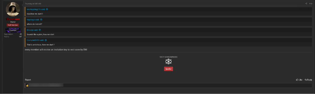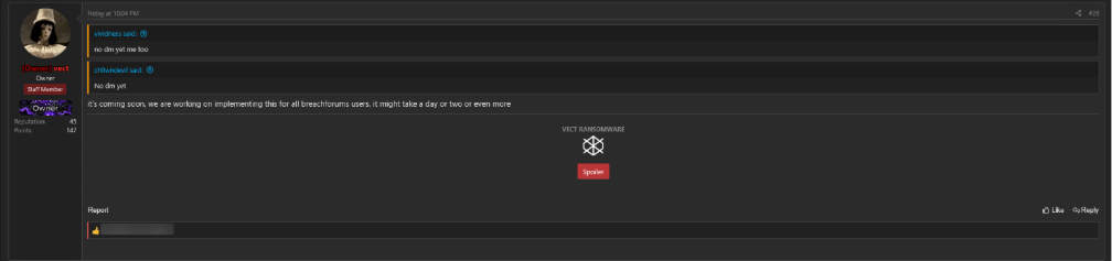 According to Vect, affiliate keys have not been distributed yet. The ransomware group is actively working toward their affiliate key distribution system, replying to comments with updates on the status.